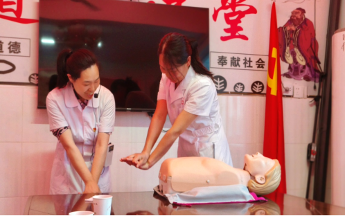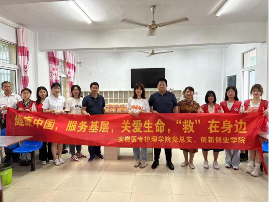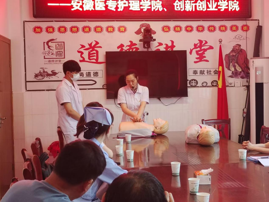 7月7日,作为全国样板支部的护理学院教师党支部充分发挥专业优势,与急救社团的同学们的前往学校定点帮扶金寨县关庙乡大埠口村,面向关庙乡卫生院的工作人员和部分村民开展“健康中国,服务基层,关爱生命,救在身边”的急救知识培训和健康宣教志愿服务活动。旨在助力乡村医生队伍专业化,普及医疗急救知识,提高乡村应急救护能力,作为应急救护培训专业讲师的吴利平老师用通俗易懂的方式为培训人员讲解心肺复苏法、AED(自动体外除颤仪)正确使用方法以及“海姆立克急救法”。还利用CPR模型进行实操技能演示,与工作人员、村民进行互动,指导操作、模拟急救演练,及时纠正操作上的错误,帮助他们熟练掌握急救操作技能,助力健康乡村建设。