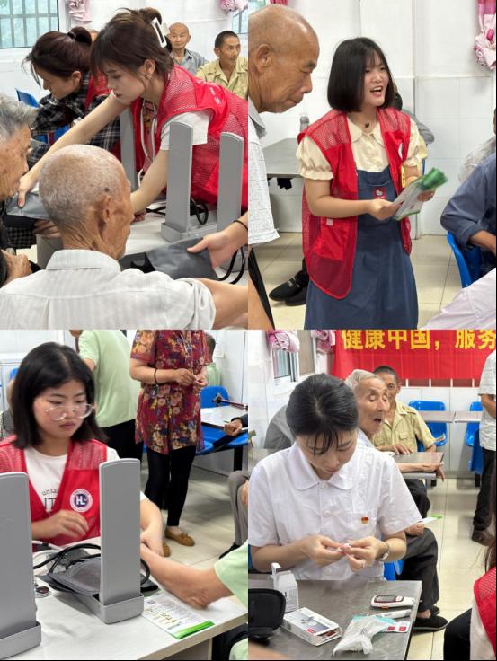 党员师生一行还来到了村里的养老院,为养老院的40多位老人开展量血压、血糖检测服务,同时宣讲健康保健知识,您的血压有点高,您要按时吃药,定期检查,平时还要饮食清淡一点.....”测完一位老人的血压后,内科护理教研室主任杨晓娟及时提醒,老人听后频频点头,连声夸道:“谢谢你们对我们的关爱”。志愿者们结合老人们的年龄特征以及身体状况,以通俗易懂的方式针对性地为老人们讲解营养膳食、运动锻炼等方面的注意事项,提升老人们的健康意识。学生志愿者们还与老人们交流谈心,了解老人们的饮食健康、身体锻炼、日常社交、作息安排等,认真倾听老人们的故事。用耐心和陪伴传递温暖,让整个养老院充满了欢声笑语。活动最后,护理学院师生为老人们献上了丰厚的生活爱心物资。