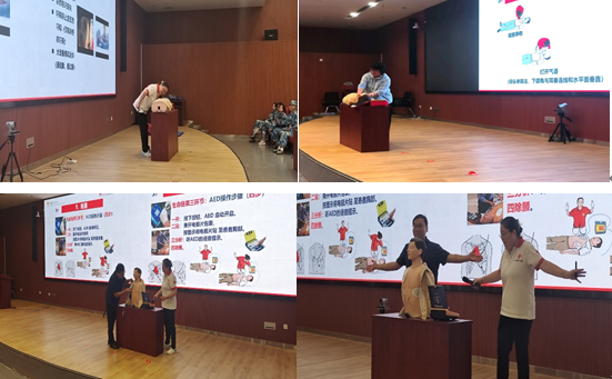 随后老师分别为学生们展示了现场心搏骤停、气道异物梗阻的急救方法及AED的使用,并邀请同学们上台操作,老师耐心指导,台下同学们聚精会神地观看和学习。(撰稿:张晶晶、王恒俊 审稿:朱延玲 核稿、编辑:姜楠)