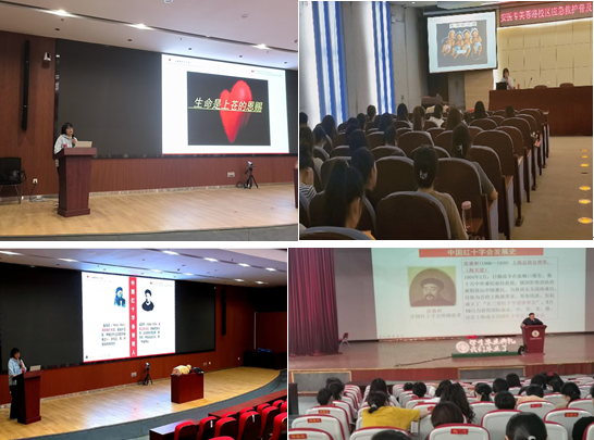 讲座首先从“生命的愿景”、“灾难就在我们身边,我们该怎么办?”、“急救医生能及时到达现场吗?”等与我们生命息息相关的现场急救问题引入本次讲座的主题——“应急救护普及培训”。之后分别从一个人、一场战争、一本书、一个组织及一个公约为同学们普及红十字运动相关知识并且延伸至中国红十字会的诞生和发展。